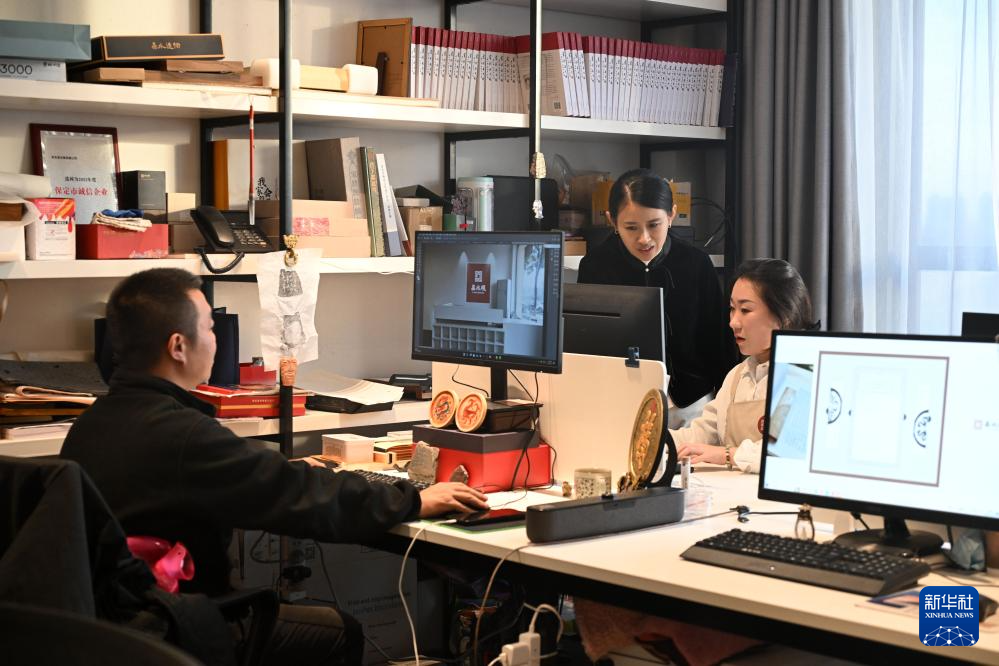 11月25日,邹天然(右二)与员工交流设计思路。