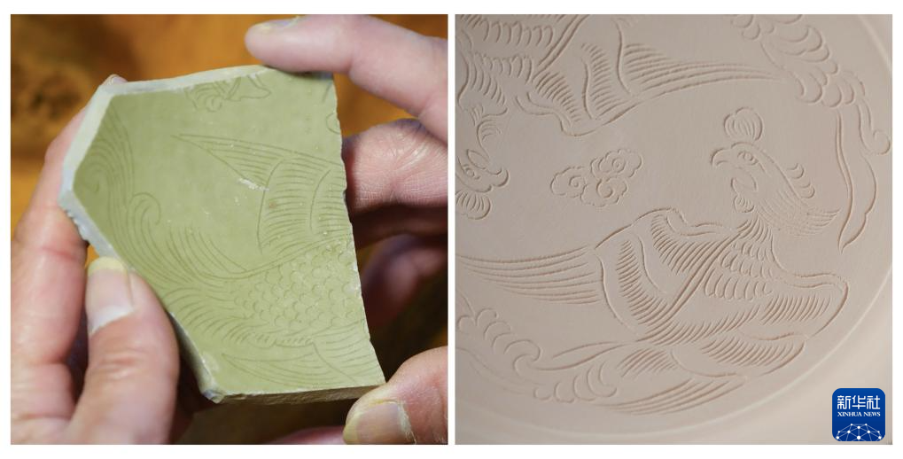 左图为施尚剑在工作室展示一块带凤凰纹饰的古越窑瓷片;右图为施尚剑在瓷坯上刻绘的凤凰纹(拼版照片,4月17日摄)。