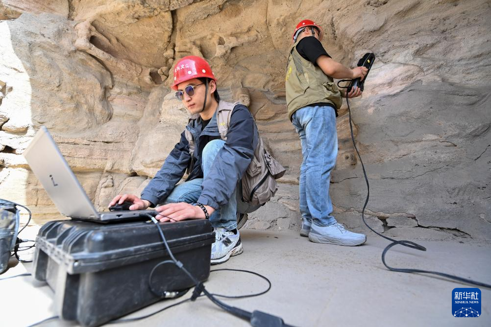 4月16日,在云冈石窟,云冈研究院数字化保护中心工作人员潘博(右)在进行数字化信息采集。