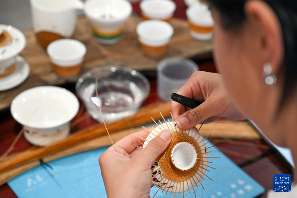 5月17日,残疾人工匠刘罗琳在活动现场制作竹丝扣瓷。