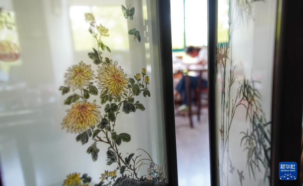 6月6日,在东台嘉丽发绣厂,东台发绣传承人陈伯余指导徒弟绣制发绣作品。