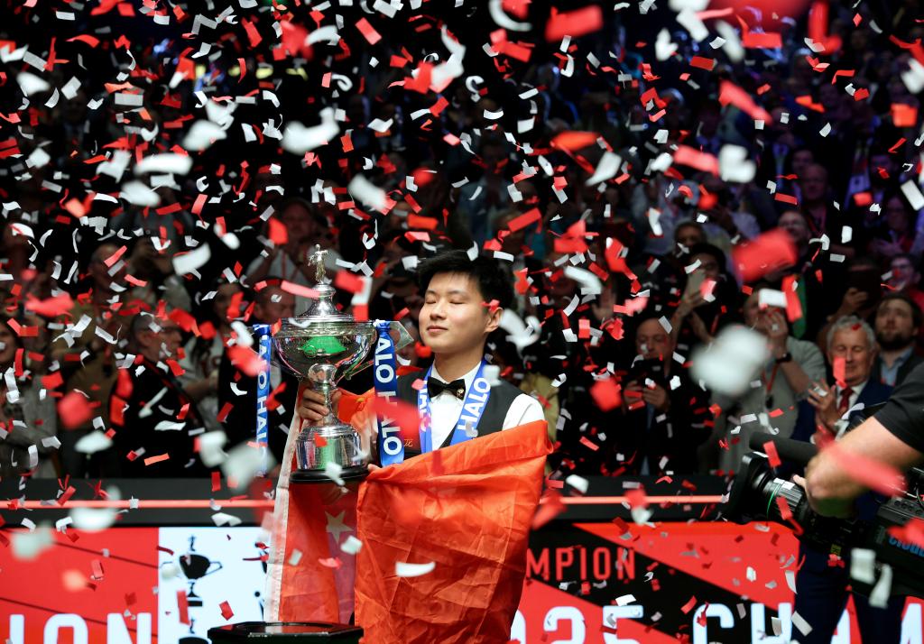 5月5日,赵心童在2025年斯诺克世锦赛颁奖仪式上。新华社发(翟政 摄)