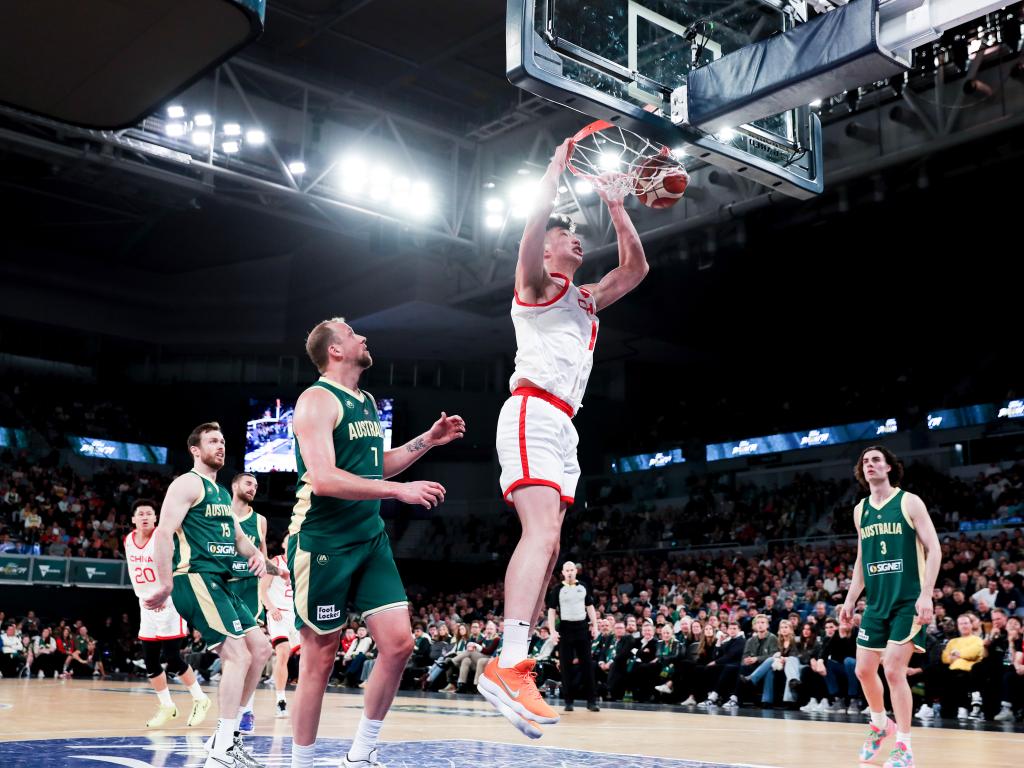 2024年7月2日,余嘉豪(上)在澳大利亚墨尔本举行的一场男篮热身赛中。新华社记者 马平 摄