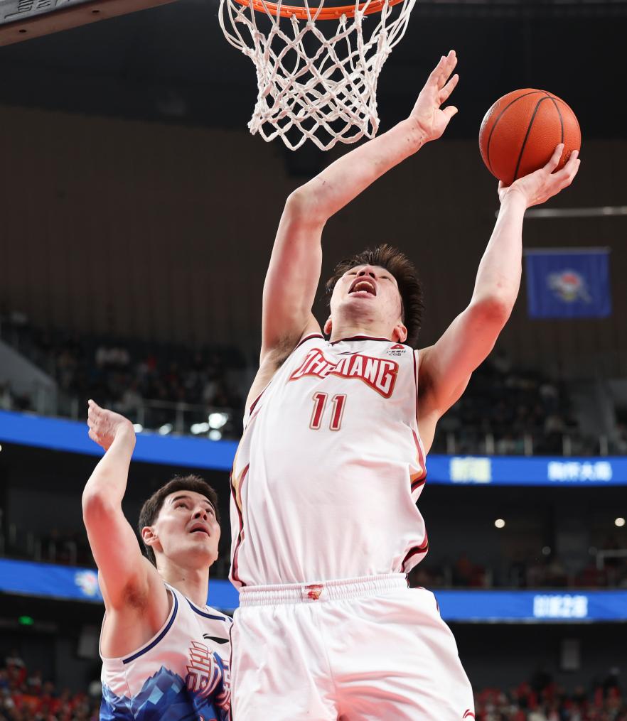 2024年12月25日,余嘉豪(上)在2024-2025赛季中国男子篮球职业联赛(CBA)常规赛第22轮比赛中。新华社发(郑家雄摄)