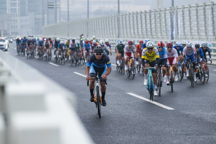 2024年11月24日,参赛选手在澳门大桥骑行。当日,2024粤港澳公路自行车赛暨第十五届全国运动会公路自行车测试赛举行。新华社记者 张金加 摄