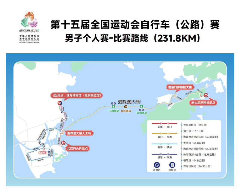 据介绍,本次公路自行车男子个人赛赛程231.8公里,从珠海博物馆出发,经港珠澳大桥进入澳门,再由大桥前往香港,途经香港迪士尼乐园后返回,经港珠澳大桥到横琴,最后回到珠海情侣路。比赛将于上午9时发枪,全程约5个多小时,将有23个代表队及两名个人运动员,共104名运动员参赛。