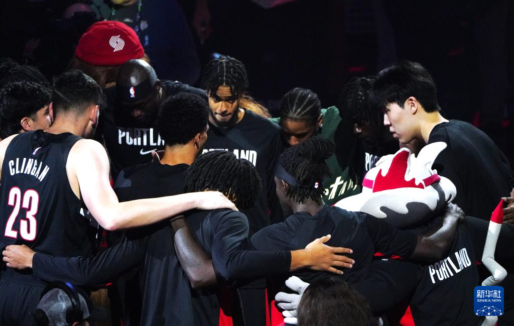 11月5日,开拓者队球员杨瀚森(右一)在开场前和队友互动。