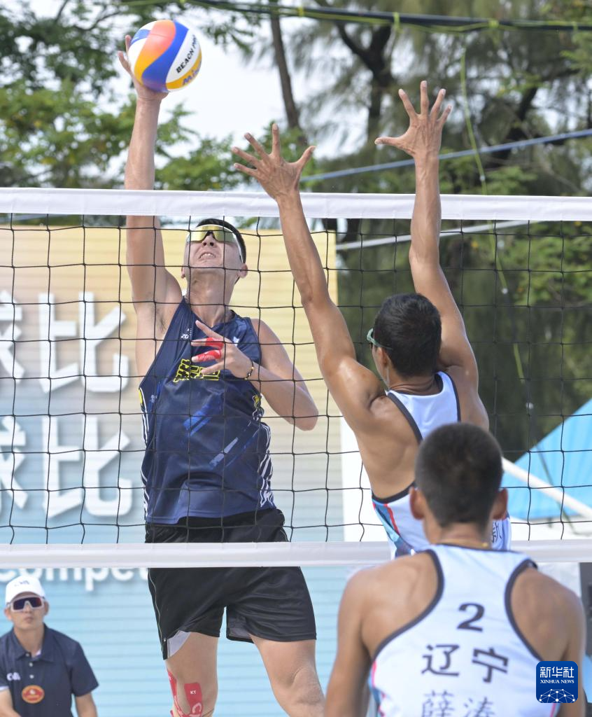 11月6日,江苏一队球员周朝威(左)在比赛中扣球。最终,江苏一队组合吴佳欣/周朝威2比0战胜辽宁二队组合冯创业/周守郅,晋级1/4决赛。