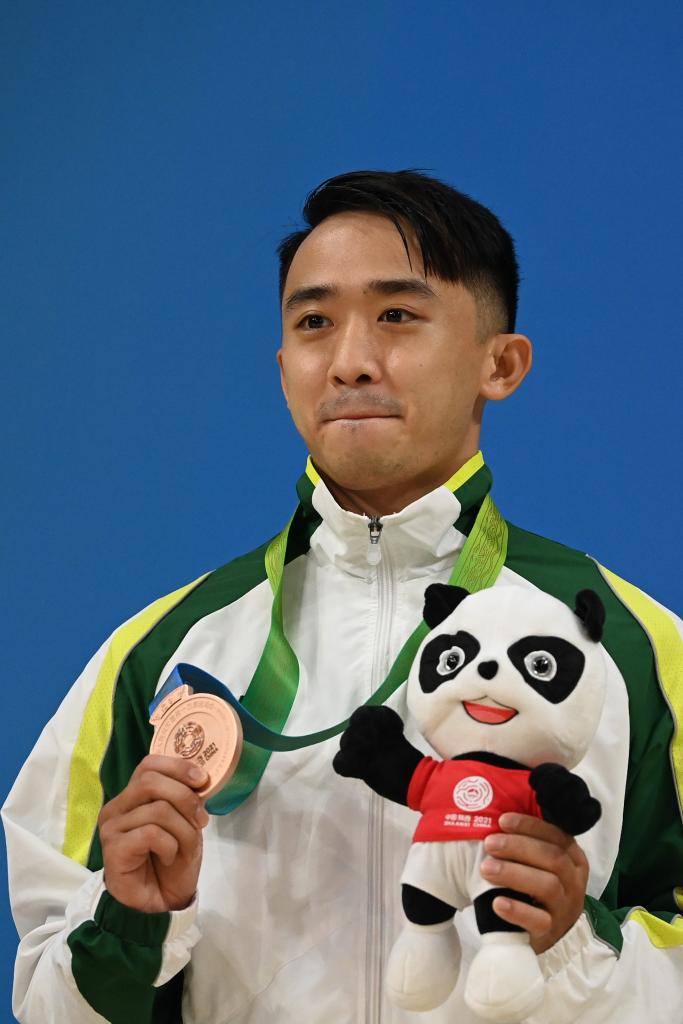 2021年9月18日,澳门队选手郭建恒在颁奖仪式上。当日,在西安举行的第十四届全运会空手道比赛男子个人型比赛中,澳门队选手郭建恒以25.02分获得铜牌。新华社记者 颜麟蕴 摄