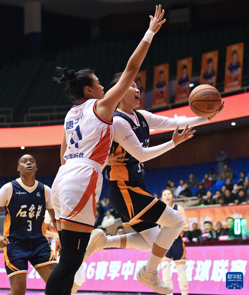 12月22日,石家庄英励队球员彭晓彤(右一)在比赛中上篮。