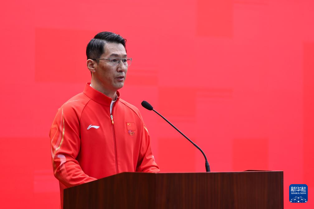 1月27日,教练员代表、自由式滑雪空中技巧队主教练纪冬在大会上发言。
