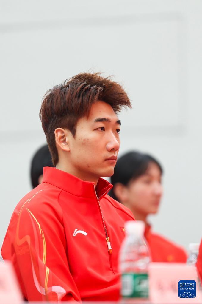 1月27日,短道速滑运动员范可新(左二)等在大会上。