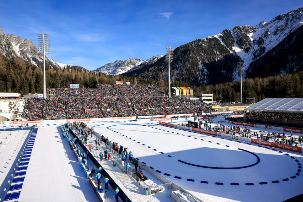 米兰冬奥会的冬季两项比赛就要在此上演。自2月8日起,将有来自29个国家和地区的约210名运动员,在11个奖牌项目中展开角逐。这座场地最多可容纳约19000人观赛,也是本届冬奥会观众容量最大的比赛场馆。