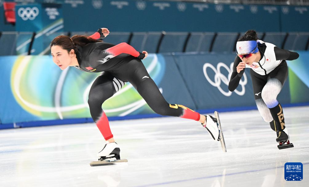 2月5日,中国速度滑冰运动员韩梅(左)和日本速度滑冰运动员高木美帆在训练中。