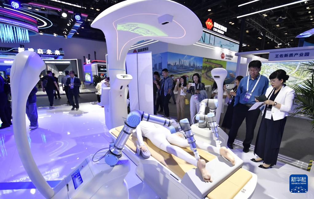 5月8日,观众在第二十七届中国北京国际科技产业博览会上了解数字中医循经调理机器人。