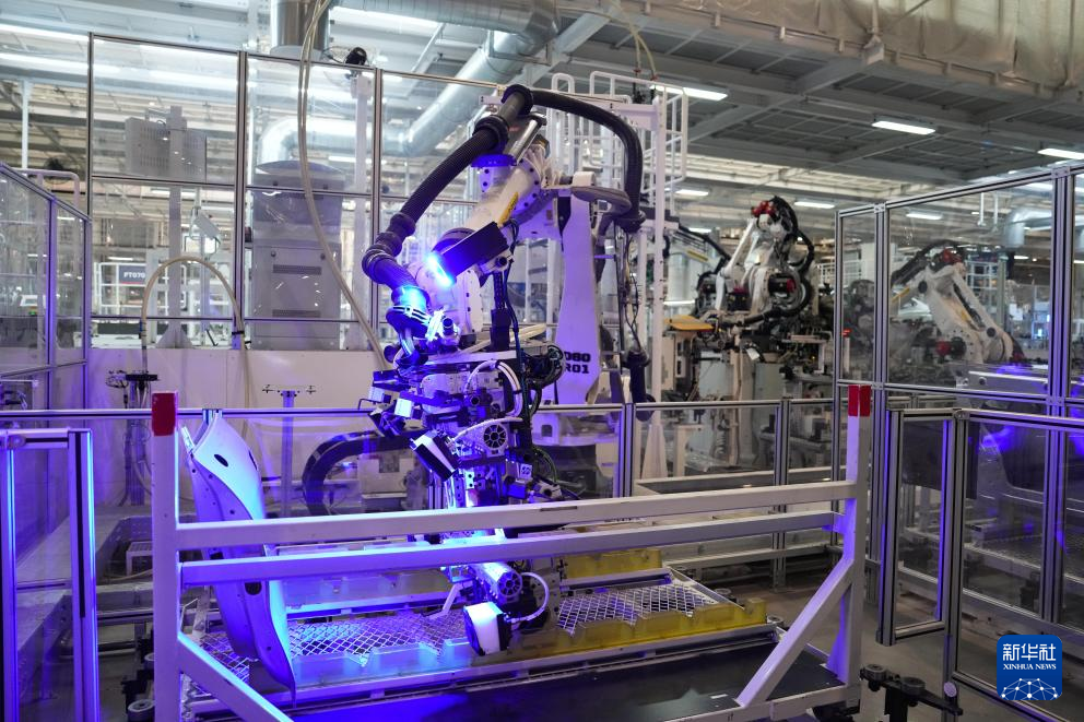 6月16日,机器人在北京小米汽车工厂车间流水线上工作。