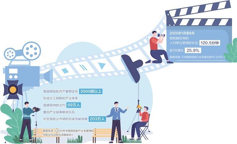 作为数字文化产业的新兴赛道,微短剧凭借轻量生产、快速迭代的特质,已成为拉动就业的新引擎。北京大学国家发展研究院近期发布的《2025年中国微短剧产业发展格局与就业拉动效应测算报告》显示,我国微短剧月产量稳定在3000部以上,形成分工明晰的产业体系,直接吸纳就业约69万人,叠加产业链乘数效应后,对全国就业市场的总体贡献突破203万人。这一新兴产业不仅消化了传统影视行业的存量就业需求,更拓展了就业增量、优化了就业结构,为不同群体提供了多元就业机会,走出了一条新业态带动高质量就业的特色路径。