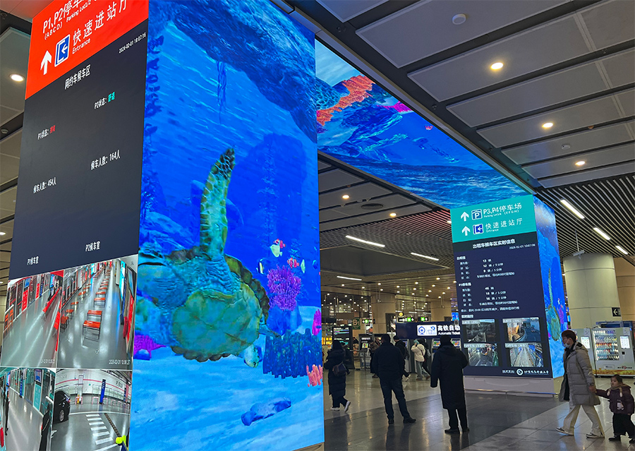 记者在现场看到,在地下换乘层西侧通道新增2处立柱式智能LED屏,能够有效分区规划,实时显示区位图、停车场引导标识、出租车情况等内容,实现美观与指引的双重功能,更方便旅客动态掌握信息。