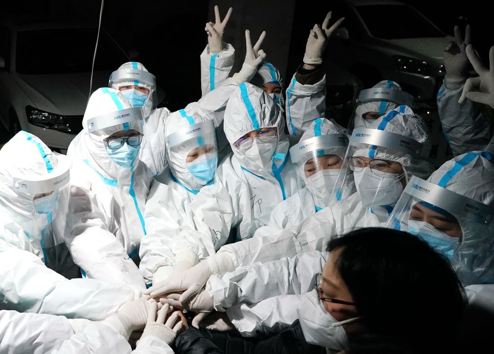 ↑1月7日,在石家莊市裕華區九里庭院社區,醫務人員開展核酸檢測前相互加油鼓氣。