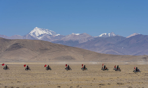 夜幕降臨高原,一天的訓(xùn)練結(jié)束。隊(duì)員們騎著車從鄉(xiāng)里散去,出發(fā)前不忘再緊一緊車尾的國旗。一輪明月懸在喜馬拉雅山脈的群山上,照亮了守邊人的回家路。