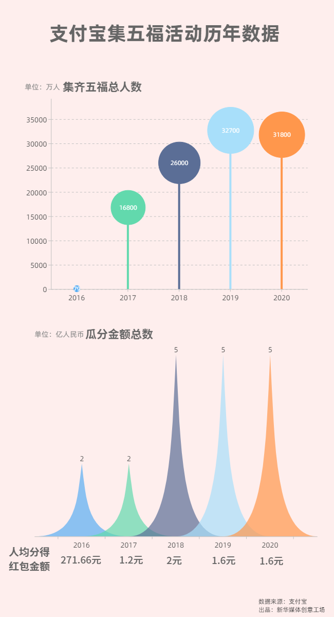自2016年支付寶推出“集五福”的活動(dòng)至今已有五個(gè)年頭。從最開始只有幾十萬用戶參與,到如今幾億人共同狂歡。支付寶數(shù)據(jù)顯示,截至2月11日零點(diǎn),支付寶集五福活動(dòng)共寫下近5.7億個(gè)福字,共2.6億網(wǎng)友在線上手寫了福字,送給親朋好友,其中還有350萬福字通過支付寶打印、寄送回家。今年參與紅包拜年的用戶上漲了近270%,“紅包”相關(guān)搜索量也隨之大漲538%。