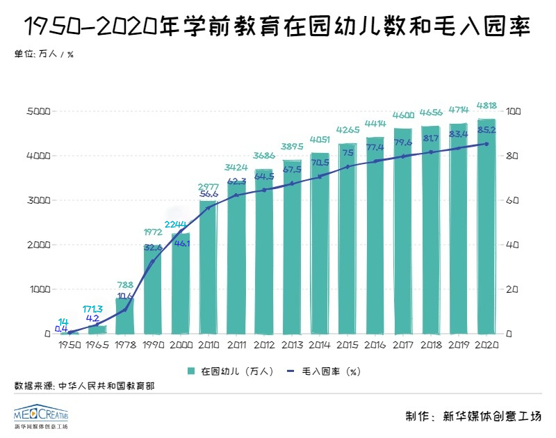 新中國成立以來,我國學前教育實現了快速發展。1950年我國學前教育在園兒童人數僅為14萬人,這個數字在2020年達到4818萬,學前教育毛入園率更是從1950年0.4%提高到2020年的85.2%。