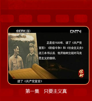 歷史文獻紀錄片《信仰》,認真貫徹落實黨的十七屆六中全會精神和胡錦濤總書記在慶祝中國共產黨成立90周年大會上的重要講話精神,以黨的90多年歷程為背景,以理想信念教育為主題,通過講述革命、建設、改革各個歷史時期優秀共產黨員堅持理想信念、發揮先鋒模范作用、保持先進性和純潔性的故事,闡述了中國共產黨人的核心價值觀。[簡介] [解說詞]
