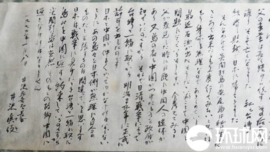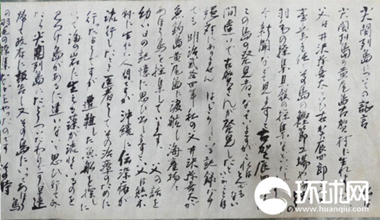 ????伊澤彌喜太長女伊澤真伎1901年2月生于黃尾嶼。她于1972年1月8日口述并請人代筆,用毛筆寫下一份《關(guān)于尖閣列島的證言》,其中披露了其父伊澤彌喜太1891年首次登島開發(fā)一事,并明確指出釣魚島“應(yīng)該歸還給它的故鄉(xiāng)——中國”。筆者現(xiàn)將部分證言的譯文公諸于眾:“我出生于尖閣列島(譯者注:釣魚島列島)的黃尾島古賀村。父親是井澤彌喜太(注:經(jīng)核實(shí)應(yīng)為伊澤彌喜太,屬于同音字記錄筆誤)。他曾任古賀辰四郎的業(yè)務(wù)主任,在該島經(jīng)營干制鰹魚工廠,也采集信天翁的羽毛以及貝殼等。現(xiàn)在報紙等報道稱古賀辰四郎是第一個發(fā)現(xiàn)該島嶼的人,這是彌天大謊,是絕對不可能的事情。因為有明文記錄可以證明,我父親于明治二十四年(1891年)航行至魚釣島(即釣魚島)、黃尾島,打撈海產(chǎn)品和采集信天翁的羽毛?!赣H登島后曾對其進(jìn)行調(diào)查,期間在一個洞穴里發(fā)現(xiàn)兩具身著中國服裝的骸骨?,F(xiàn)在看來,在父親登島之前可能已有中國人達(dá)到此處。父親和古賀相識是因為古賀當(dāng)時很有錢,他曾主動向父親提出:‘你在沖繩經(jīng)營事業(yè)需要資金,我們一起合作怎么樣?!驗槭枪刨R出資,所以名義上是古賀經(jīng)營,但一切事務(wù)實(shí)際上都是由我父親全權(quán)負(fù)責(zé)的。古賀也曾說過,他允許我父親在那里自主隨意地經(jīng)營。