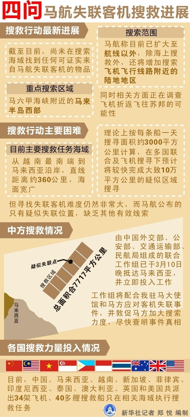 ????目前,中國、馬來西亞、越南、新加坡、菲律賓、印度尼西亞、泰國、澳大利亞、英國和美國共派出34架飛機、40多艘搜救船只在相關海域執行搜救任務。