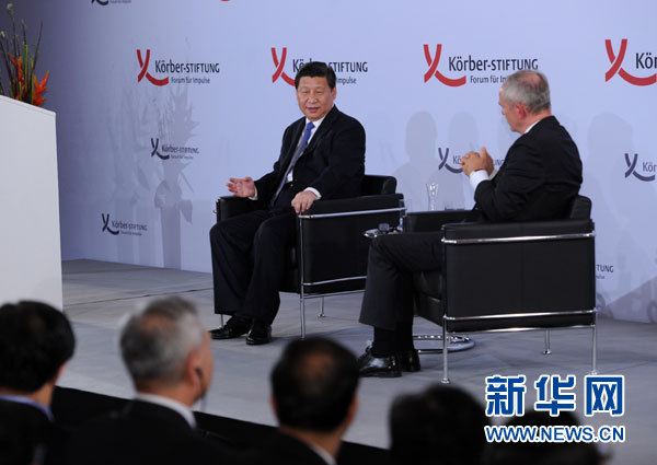 ??? 這是演講結束后習近平主席回答科爾伯基金會常務副主席魏邁爾的提問。新華社記者 饒愛民 攝