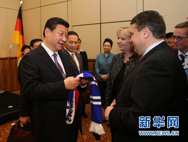 ??? 3月29日,中國國家主席習(xí)近平在杜塞爾多夫出席中德工商界舉行的招待會并發(fā)表題為《把握中國機遇,實現(xiàn)共同發(fā)展》的重要講話。這是招待會開始前,習(xí)近平在會見中德企業(yè)家代表時,德國副總理兼經(jīng)濟和能源部長加布里爾(前右)向習(xí)近平贈送一家德國足球俱樂部球迷標志性圍巾。新華社記者劉衛(wèi)兵攝