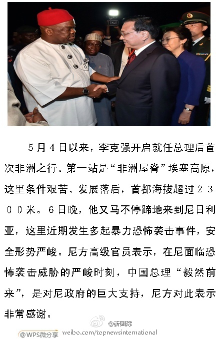 ????新華網(wǎng)北京5月7日電 據(jù)新華社“新國(guó)際”微博報(bào)道,5月4日,李克強(qiáng)開(kāi)啟就任總理后首次非洲之行。繼首站訪(fǎng)問(wèn)條件艱苦、發(fā)展落后的“非洲屋脊”埃塞高原后,6日晚,他又馬不停蹄地來(lái)到面臨恐怖襲擊威脅的尼日利亞。尼方高級(jí)官員表示,中國(guó)總理“毅然前來(lái)”,是對(duì)尼政府的巨大支持,尼方對(duì)此表示非常感謝。