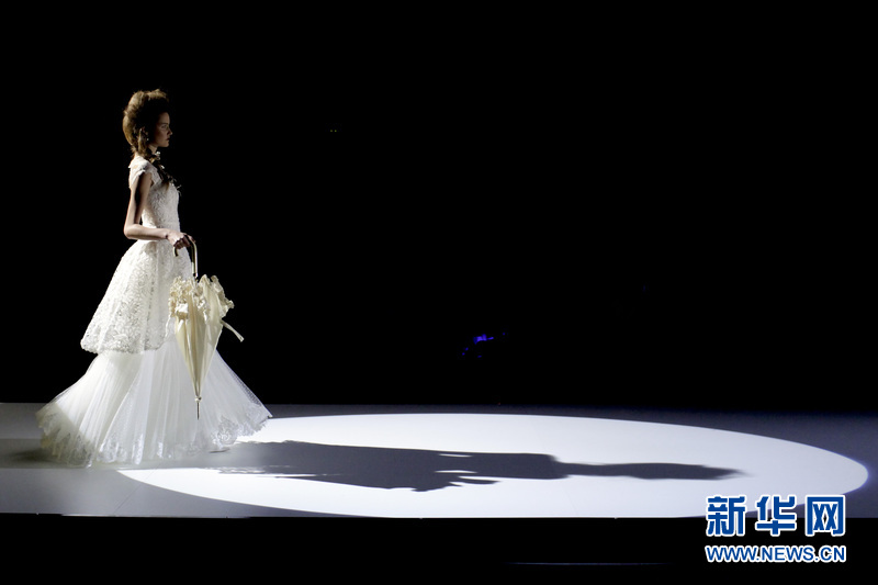 模特在T臺上展示西班牙女服裝設計師 Inmaculada Garcia的婚紗作品。Inmaculada Garcia同時也是來自巴塞羅那當地的一個婚紗品牌。
