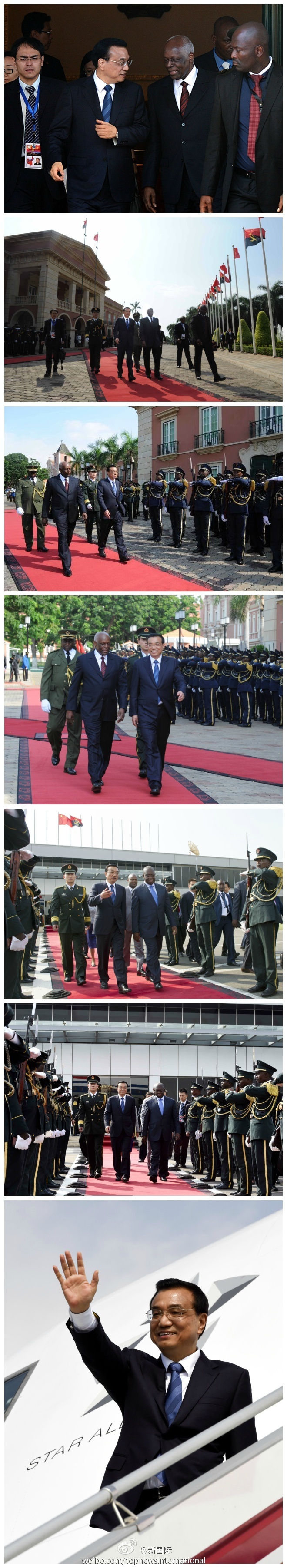新華網北京5月10日電 據新華社“新國際”微博報道,當地時間9日下午,李克強總理結束了在安哥拉的密集訪問行程,安總統多斯桑托斯夫婦在總統府為李克強夫婦舉行歡送儀式,安副總統維森特和外長希科蒂到機場為李克強夫婦送行。