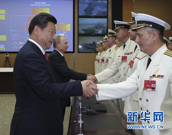 國家主席、中央軍委主席習近平20日在上海吳淞海軍軍港,同俄羅斯總統普京一起出席“海上聯合-2014”中俄海上聯合軍事演習開始儀式并看望兩國海軍官兵代表。