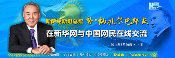 ????新華網(wǎng)上海5月20日電 哈薩克斯坦總統(tǒng)納扎爾巴耶夫20日接受新華網(wǎng)獨(dú)家訪談與中國(guó)網(wǎng)民在線交流,回答中國(guó)網(wǎng)民的問(wèn)題。