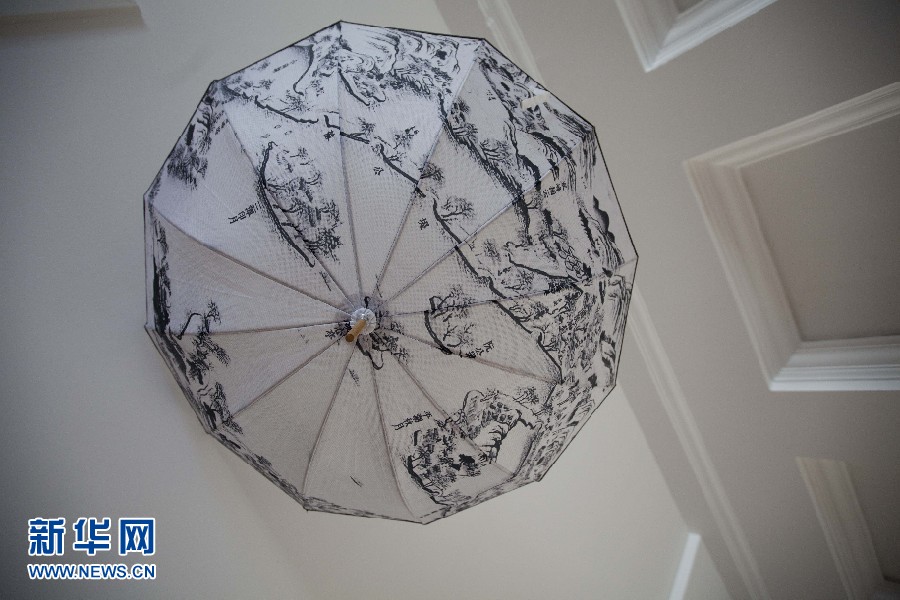 圖為10日所拍攝的“融?工藝設(shè)計生活”設(shè)計展上的一把糊傘。