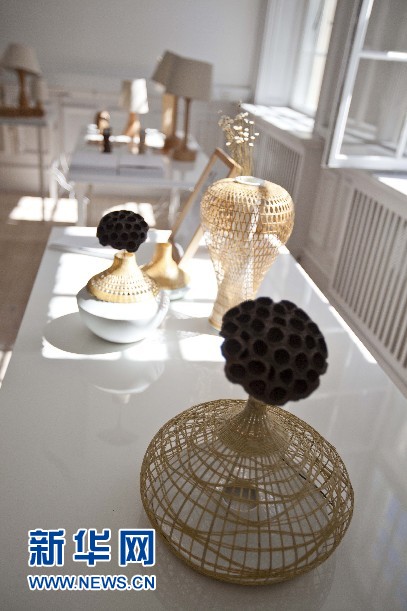 圖為10日所拍攝的“融?工藝設(shè)計生活”設(shè)計展上用竹條編織的花瓶。