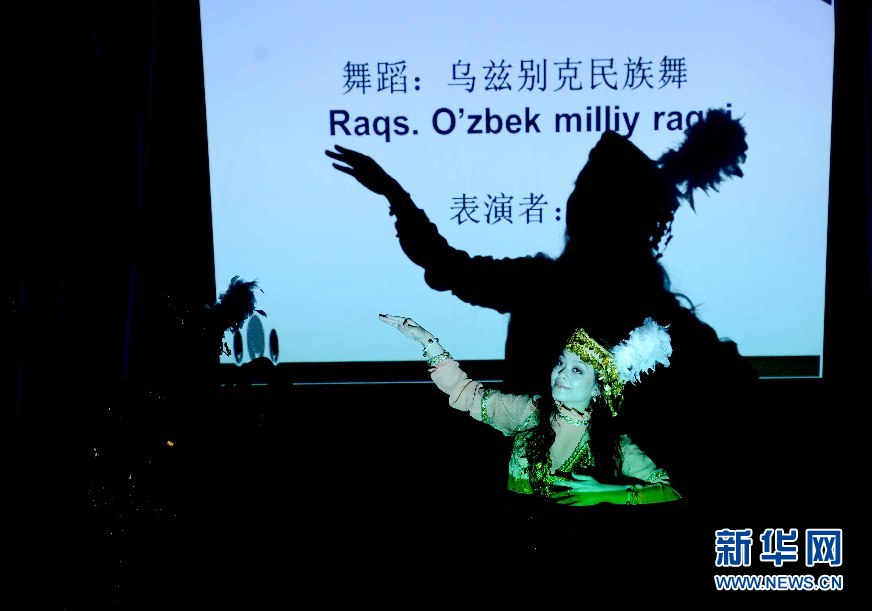 6月9日,學(xué)生代表在烏茲別克斯坦首都塔什干的烏世界語言大學(xué)禮堂表演節(jié)目。
