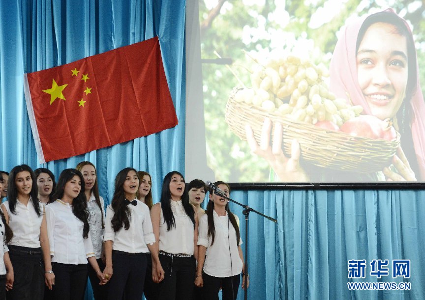 6月9日,學生代表在烏茲別克斯坦首都塔什干的烏世界語言大學禮堂表演節(jié)目。