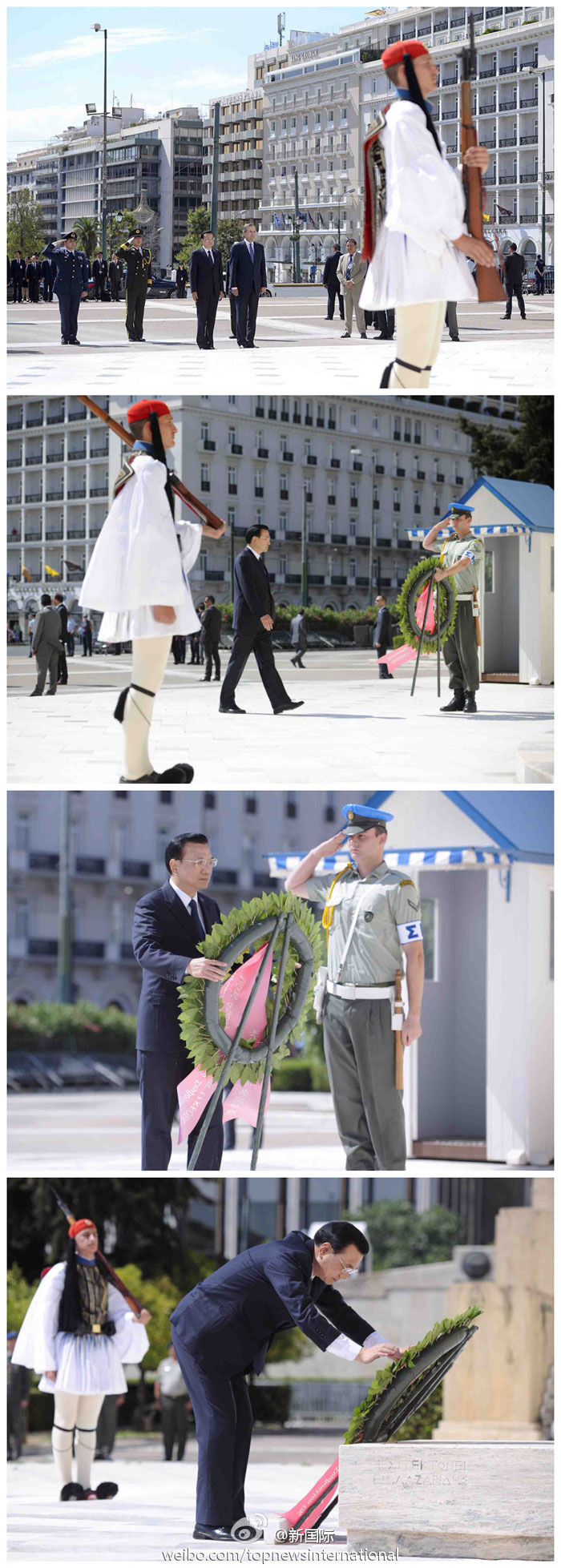 ??? 新華網北京6月20日電 據新華社“新國際”微博報道,正在希臘訪問的李克強總理19日向希臘無名戰士紀念碑獻花圈。該紀念碑1932年建成,碑上鐫刻公元前5世紀希臘政治家伯里克利斯一篇悼詞中的兩句名言:“全世界杰出戰士之墓”、“安放無名氏的床第”,及希臘從上世紀初到五十年代與外國交戰的戰役名稱和地名。