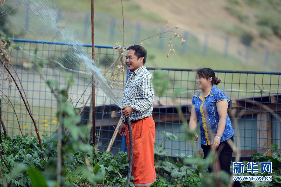 ????7月5日,烏茲別克斯坦安革連至琶布鐵路隧道項目安革連隧道進口西口分部生活區(qū),楊清海在澆水。(沙達提 攝)