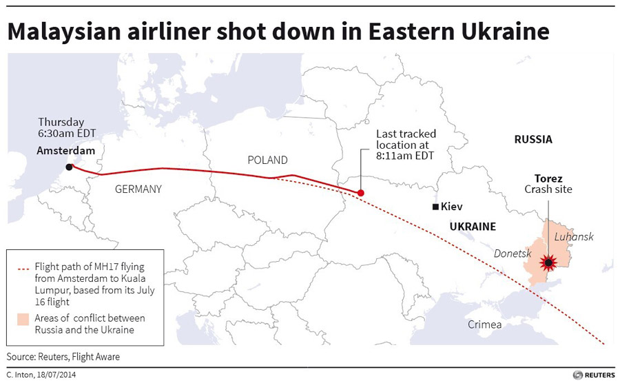 當地時間7月17日,一架從阿姆斯特丹起飛的馬航客機在烏克蘭領空與地面失去聯系。這架飛機墜毀在烏克蘭頓涅茨克州斯涅日諾耶居民點附近,機上298人全部遇難。英國路透社繪制了一張客機路線圖。