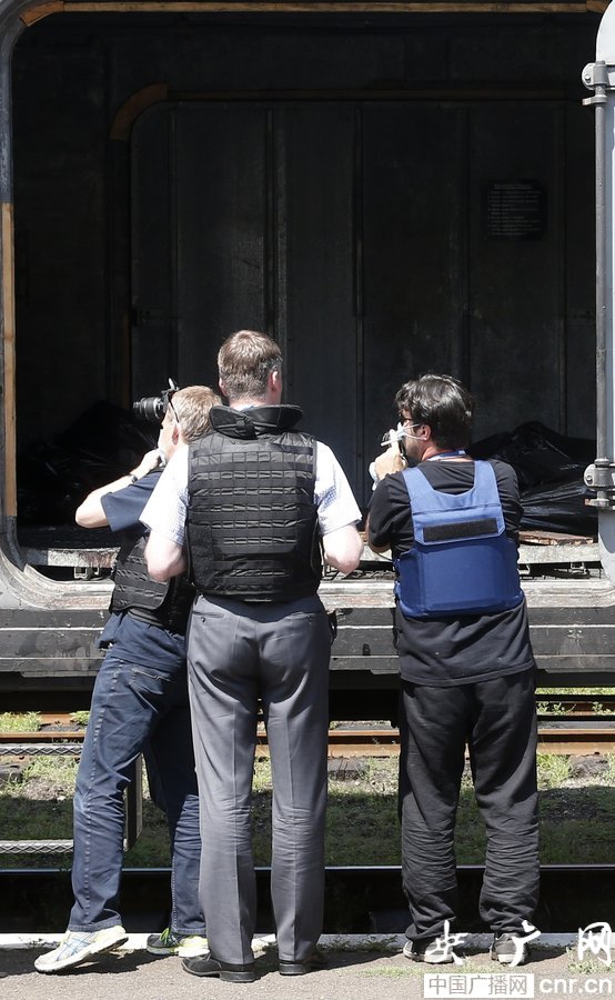 當(dāng)?shù)貢r(shí)間2014年7月20日,烏克蘭頓涅茨克Torez,馬航墜機(jī)遇難乘客遺體被裝上列車(chē)?yán)洳剀?chē)廂將被運(yùn)走。載有部分遺體的火車(chē)從距空難現(xiàn)場(chǎng)不遠(yuǎn)的烏克蘭托列茲市出發(fā),前往頓涅茨克市。火車(chē)離站前,身處空難現(xiàn)場(chǎng)的歐洲安全與合作組織(歐安組織)代表檢查了運(yùn)載遺體的5節(jié)冷藏車(chē)廂。