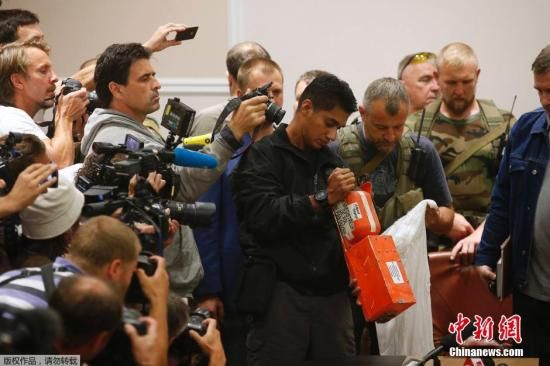 當地時間2014年7月22日,頓涅茨克,“頓涅茨克人民共和國”官員向馬來西亞調查人員移交馬航MH17航班客機黑匣子。