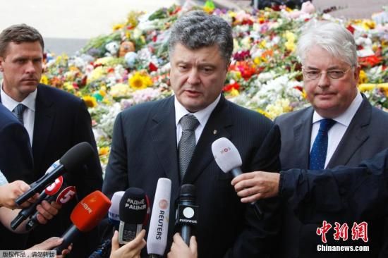 當地時間7月21日,烏克蘭基輔,烏克蘭總統波羅申科在荷蘭駐烏克蘭大使館外悼念馬航MH17遇難者。