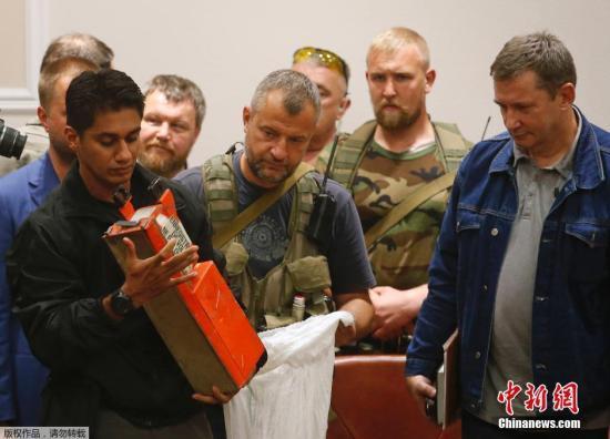 當地時間2014年7月22日,頓涅茨克,“頓涅茨克人民共和國”官員向馬來西亞調查人員移交馬航MH17航班客機黑匣子。
