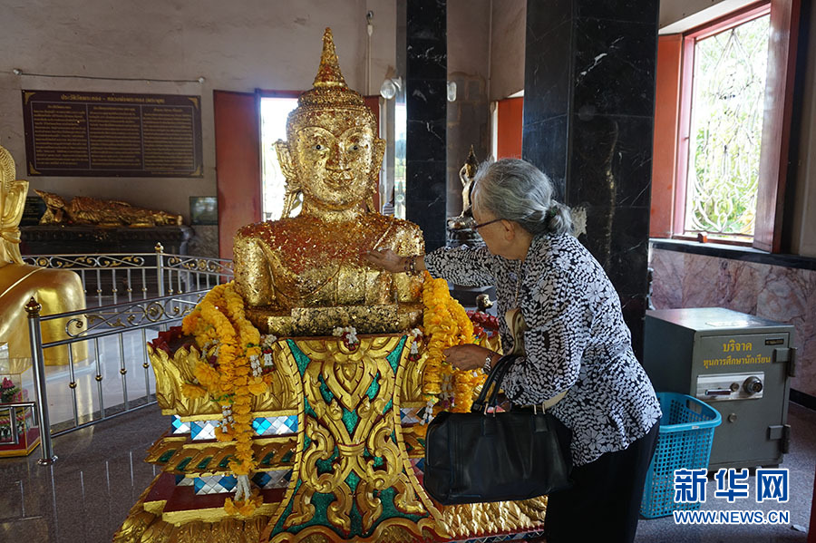 一名許愿者正向金佛模型上貼金箔。新華網記者 楊云燕 攝