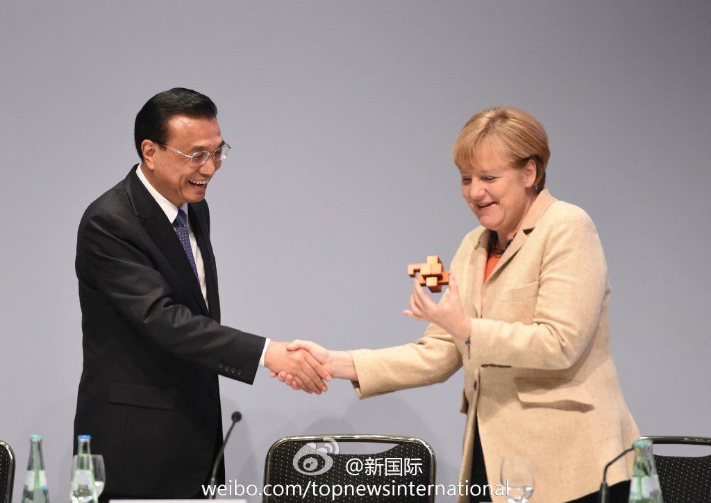 ????新華網北京10月11日電? 據新華社“新國際”微博報道,10日的中德經濟技術論壇上,李克強總理將一精巧的魯班鎖送給默克爾。他說,這是天津中德職業技術學院師生共同創作的作品,希望我送給默克爾總理。解開魯班鎖是解決一道難題,相信中德之間的合作能不斷創新,共同破解世界性難題,開啟美好的未來。