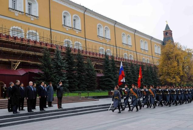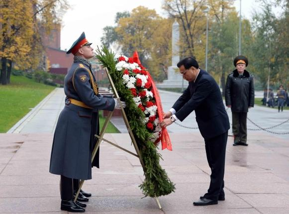 ????新華網北京10月14日電 據新華社“新華國際”客戶端報道,一場秋雨洗滌了莫斯科的寒夜。13日一早,克強總理來到克里姆林宮外的無名烈士墓,憑吊衛(wèi)國戰(zhàn)爭中的犧牲者。